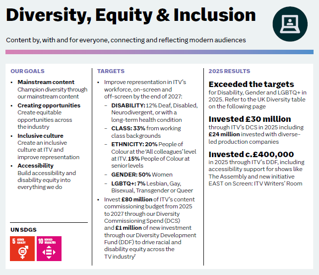7. The second round of ITV’s Diversity Commissioning Spend (DCS) and Diversity Development Fund (DDF) runs from 2025-27. For more information on the DCS and DDF in 2025, refer to our 2025 Impact Report. For information on the first round of our Diversity Commissioning Spend (2022-24), refer to our 2024 Diversity Acceleration Plan report. Both reports can be found at: www.itv.com/inclusion/articles/diversity-acceleration-plan